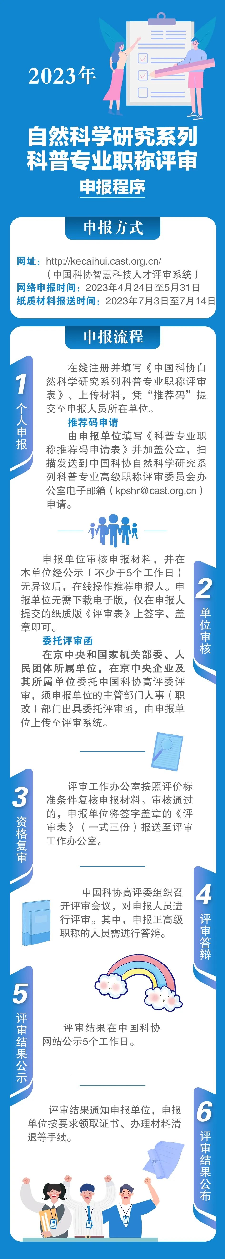 发布时间:2023-04-30 14:23:375457次浏览中国科协2023年度自然科学研究系列科普专业职称评审已开始申报,请有意向且符合条件的人员关注申报,按通知要求需在“中国科协智慧科技人才评审系统”(http://kecaihui.cast.org.cn/)进行网络在线填报。